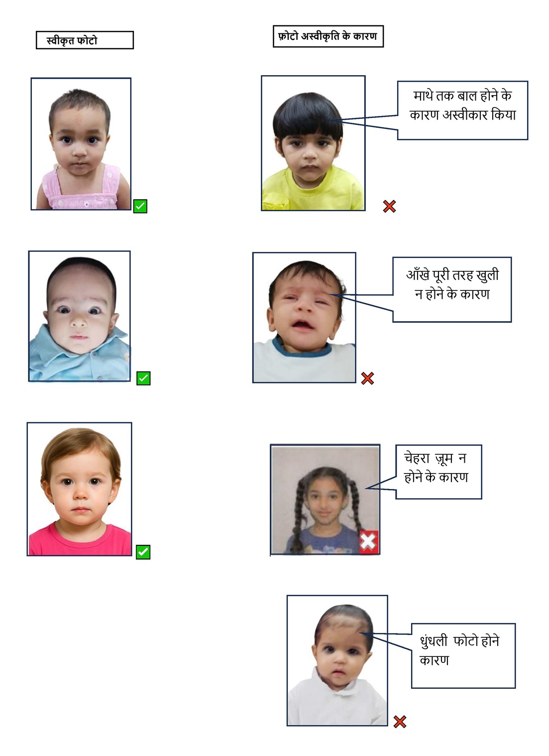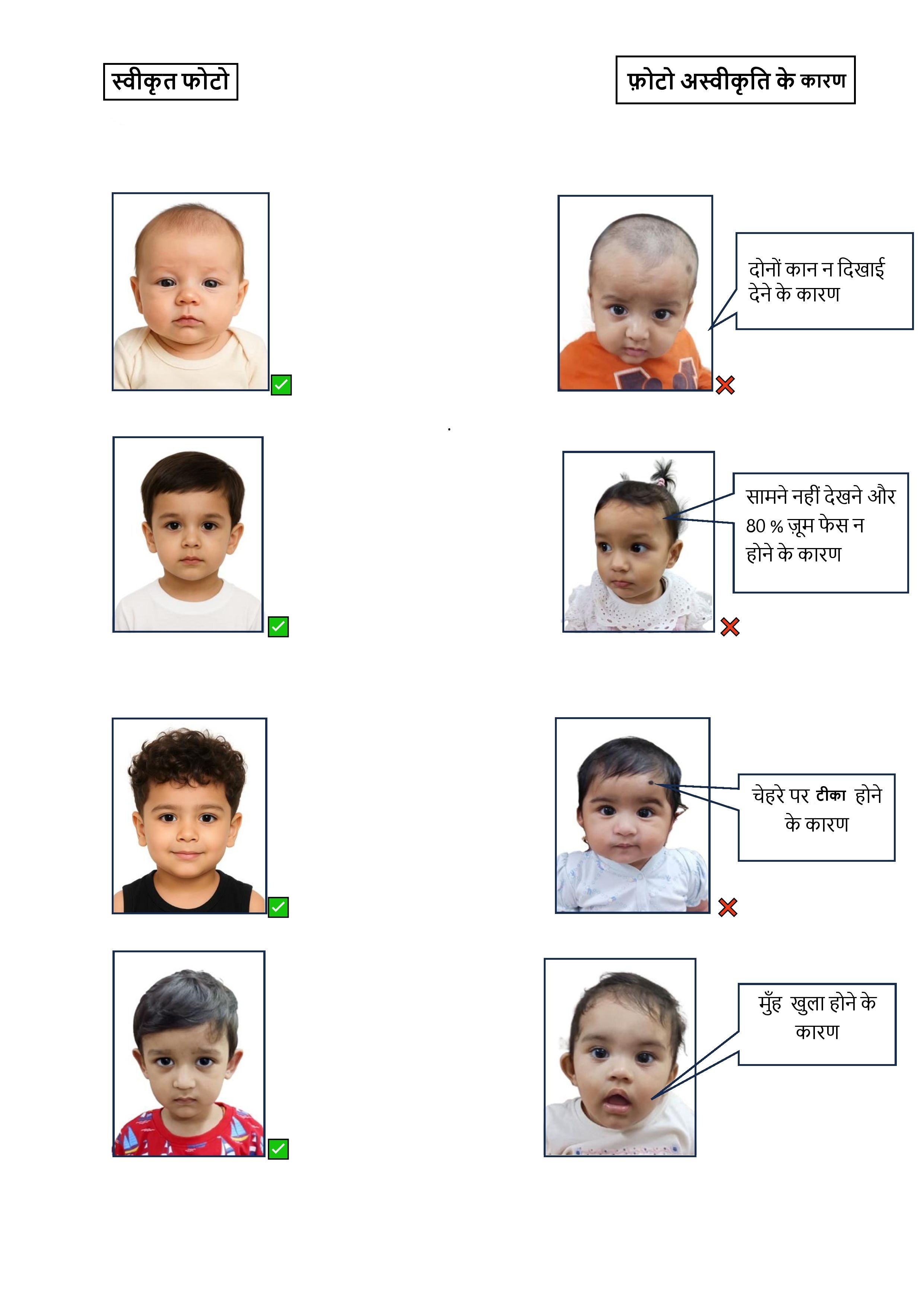 - बच्चे के दोनों कान, ठोड़ी, आंखें स्पष्ट रूप से सामने दिखाई देनी चाहिए।